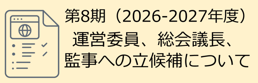 総会の正式な招集はは改めてご連絡させていただきますが、今年度の総会では、運営委員、総会議長、監事等の選任を行います。立候補を希望する機関は下記を参照の上、期日までに事務局まで届出をお願いいたします。